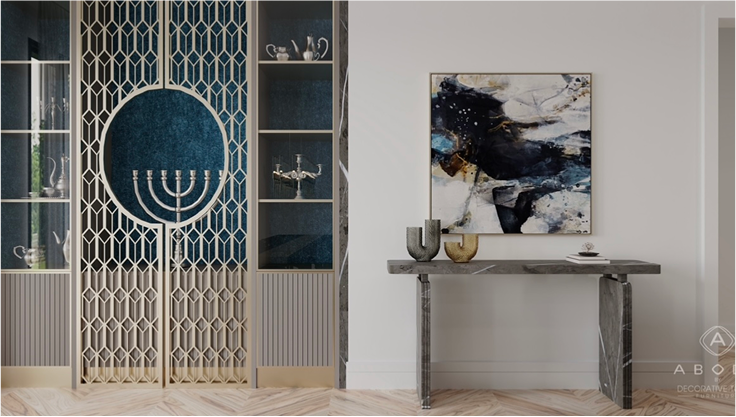 A more modern nod toward Judaica paintings, this client favorite was an integral part of their living space, so we perfectly complemented the tones with sleek and toned down mid grey sofas, with a fresh display of mod mouldings, contemporary lighting, and a stone slab fireplace addition.